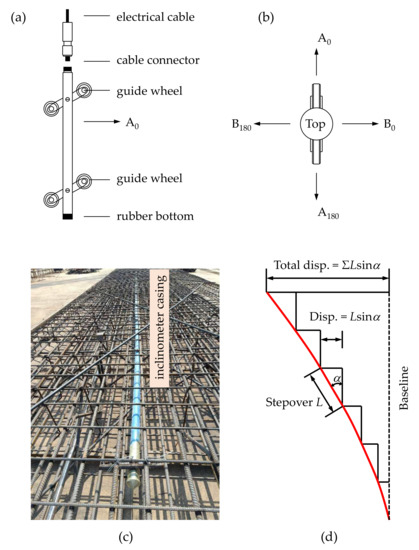 Inclinometers used to measure the lateral displacement of retaining walls. (a,b) Elevation and top view of a typical inclinometer probe [54]. (c) A tube (PVC plastic, ABS plastic or aluminium) is installed serving as the inclinometer casing for the purpose of ground measurement. (d) Measurement of lateral displacement [51].