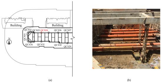 The deep foundation pit project of a subway station considered in this Section is located in Changle District, Fuzhou, China. It is a two-story, double-column, and three-span station with a length of 293 m and a width of 21.7 m. The total construction area of the station is 17,861.2 m2. The station was constructed with the cut-and-cover method. The retaining structure is a 800 mm-thick continuous wall. The layout of the monitoring points is shown in Figure 4a, where the black dots labeled with “QCX” are the monitored locations. Figure 4b presents a photo from the in-situ construction, where the reinforced concrete supports are used at the top of the excavation and steel supports are used elsewhere.
