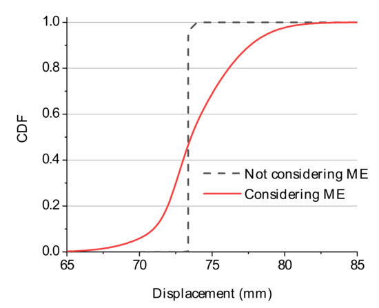 Next, the impact of ME on the deformation reliability is discussed. As introduced in Table 1, the inclinometer CX-06B used in this project has a measurement accuracy of . With this, applying Equation (23) yields . Furthermore, with Equation (24), the deformation reliability taking into account the impact of ME is estimated as . That is, in the presence of ME, the probability that the maximum lateral displacement of the retaining wall at location QCX04 does not exceed the predefined limit decreases to 49.5%. This implies that ignoring the impact of ME could significantly overestimate the deformation reliability of retaining structures.