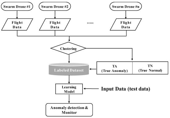 Traditional model-based methods have been intensively studied in the context of fault detection and isolation (FDI) particularly for safety-critical aerospace systems [25,26]. This has recently been extended to multi-unmanned aerial vehicle (UAV) systems from the perspective of safe operations [27,28,29] and also for resilience against cyberattacks [30,31,32,33]. In a multi-UAV system, the design and experimental verification methods and strategies have been studied to perform fault detection, identification, and recovery (FDIR) by constructing a cooperative virtual sensor (CVS) system for each UAV through on-board sensor signals [34]. These model-based schemes work well when normal behavior of the system is well-understood and predicted using (physics-based) models and also when the potential fault modes are well-identified a priori so that a finite number of hypotheses on the faultiness can be posed. However, this is not often the case for a flight of swarm drones. From the mission perspective, one reason to utilize the swarm is their robustness to single-point failure; however, it is still critical to ensure the safety and health of each vehicle that may affect the overall performance. In particular, a least thus far, small-sized drones are not designed under a high-reliability requirement; thus, the main parameters associated with motion models of the drones are prone to uncertainties. Also, these drones are relatively new in the market, compared to long-life large aircraft; as such, the fault modes are not well understood and identified. Therefore, a data-driven scheme that does not explicitly rely on the physics-based model of the vehicles can be a promising solution to anomaly detection of swarm of small-sized drones.