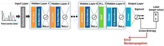 Often, another fully connected layers (i.e., multi-layer perceptron) are connected to the output layer of the 1D-CNN to perform classification or regression [45]; then, standard learning schemes such as stochastic gradient descent methods can be used to optimize the weights of the CNN and the MLP simultaneously. Note that the classification model in this work also takes this type of structure.
