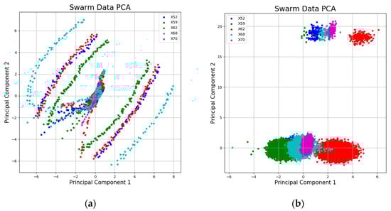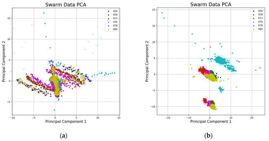 Principal component analysis (PCA) results data of Day 25 May 2018: (a) real-time kinematic global positioning system (RTK-GPS) and setpoint data; (b) sensor signals to detect anomalies in vehicle’s inertial-navigation-system data. (The legend indicates particular drone IDs).