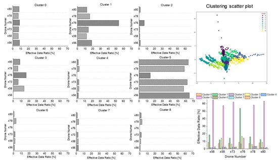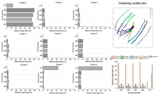 Figure 6 and Figure 7 represent equivalent results for the data obtained from a flight test on another date, 5 June 2018. From the distribution of data point across the clusters, it can be first found that data from ×70 exhibit very different characteristics from the others—the majority of this data belong to Clusters 0~6 to which only small portion of data from the other drones belong. On the other hand, significantly more data for ×70 belong to Clusters 7 and 8. Thus, we can predict ×70 includes some anomaly behavior. From the clustering results, data from each drone in Clusters 0~6 are labeled “TA” and the others in Clusters 7and 8 are labeled “TN”. While for the space reason this article only reports a couple of representative cases, a similar PCA and clustering procedure is done on all the flight tests for labeling. It should be noted that the clustering method herein does not aim for fully automated labeling but supporting an auxiliary means to aid human experts to conveniently label a large amount of unlabeled data.