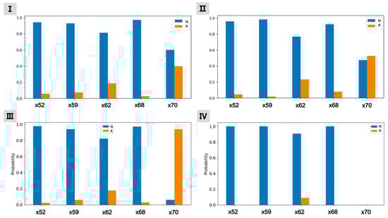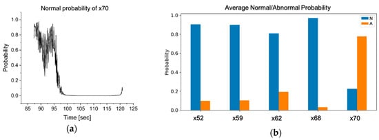 To mitigate the noise in continuous monitoring at the same time to allow for responsive detection of anomaly, this work investigates moving average-based monitoring with finite time window. The normal/abnormal probability is averaged over some specified time horizon, and is updated with a new set of data. The time window of the adjacent averaging window can be overlapped. The four subplots of Figure 11 represent the change in the normal probability of different drones as the time proceeds. The average is taken over 30 s, and every 20 s the average value is updated, meaning that 1/3 of data are overlapped between the consecutive time windows. It can be observed that the abnormal probability of ×70 is about 40% in the first time window, increases to about 55% in the second window, and eventually becomes greater than 90% in the third time window. This way, the anomaly can be monitored in a relatively high frequency without being subject to noise.