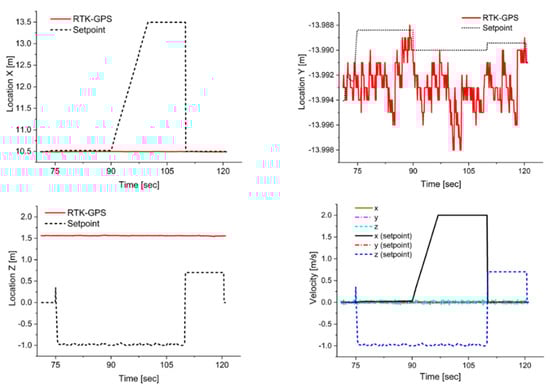 The output data from each flight sortie consists of 248 parameters, and the data are in the form of time series of these parameters some of which include multiple measurements. In this study, the following parameters that are thought to be crucial in monitoring anomalies in motion are chosen: three position coordinates and their set point values, three velocity components of the vehicles, and the vehicle status. The position coordinates (xa, ya, za) and the velocity components in three axes are obtained from RTK-GPS measurements whose accuracy was verified in [42]; the set point values (xs, ys, zs) in three coordinates generated from the mission controller are also considered as anomalies that are likely to be associated with the errors between the desired and the actual behavior in vehicle motion, i.e., the following three terms: