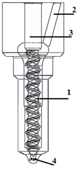 The modified fuel atomizer. (1) Channels in the non-working part of the needle, (2) the fuel supply channel, (3) the precision atomizer pair, (4) the injection holes [22].
