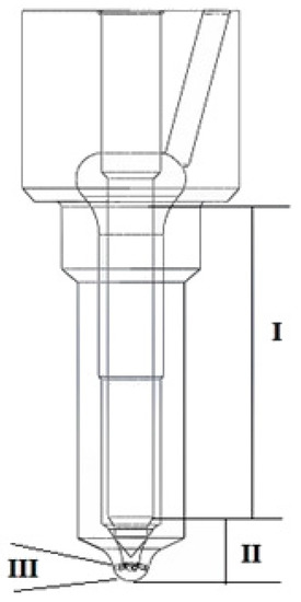 Fuel atomizer divided into zones: (I) The non-working part of the needle, (II) the needle well, (III) the outlet from the atomizer.
