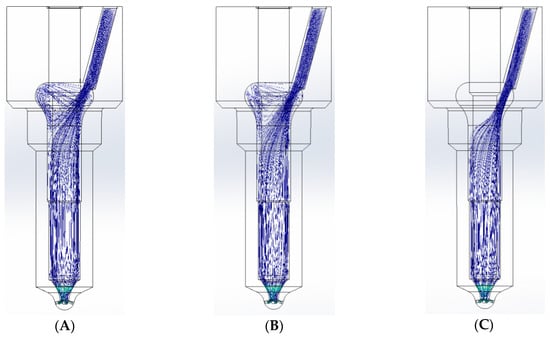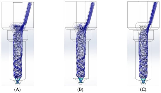 Simulation of fuel flow through a modified atomizer at 500 µs injection time and fuel temperature of 313 K. (A) System pressure of 120 MPa, injected dosage 20.9 mm3/H; (B) system pressure of 60 MPa, injected dosage 10.2 mm3/H; (C) system pressure of 30 MPa, injected dosage 2.8 mm3/H.