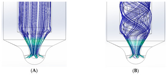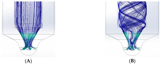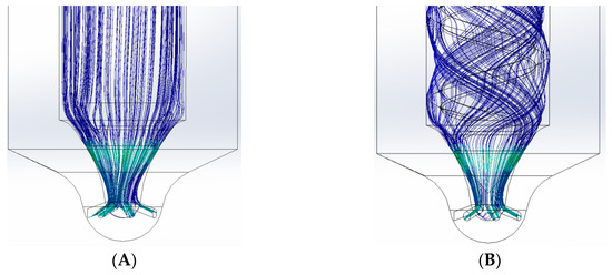 Initial fuel spray research, pressure 30 MPa, injection time 300 μs. (A) Fuel injector with a standard nozzle; (B) fuel injector with spiral-elliptical ducts.