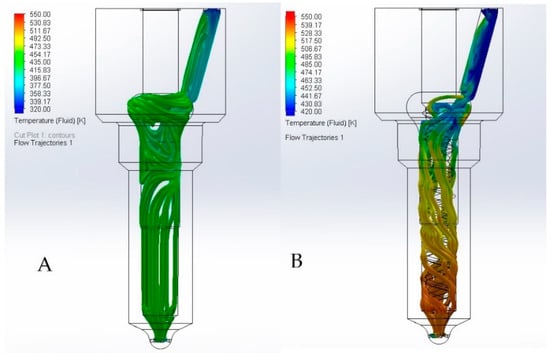 Fuel flow temperature distribution, pressure 120 MPa, fluid temperature 313 K, initial solid temperature 573 K, solid material tool steel X40Cr14. (A) Classical atomizer, (B) atomizer with spiral-elliptical ducts.