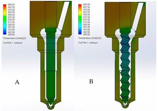 Fuel injector nozzle temperature distribution, pressure 120 MPa, fluid temperature 313 K, initial solid temperature 573 K, and solid material tool steel X40Cr14. (A) Classical atomizer, (B) atomizer with spiral-elliptical ducts.