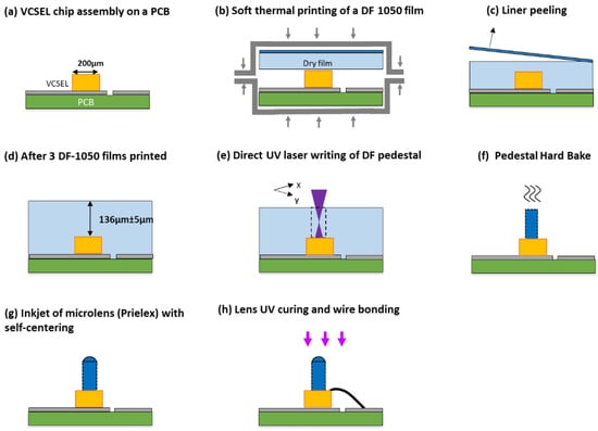 Process flow for microlens integration on a single vertical-cavity surface-emitting laser (VCSEL) chip already assembled on printed circuit board (PCB): (a) VCSEL chip assembly, (b) Soft-thermal printing of DF-1050 dry photoresist film, (c) Peeling of the liner’s film, (d) Result after 3 soft-printing of DF-1050 films, (e) Direct UV laser writing on the printed films for pedestal definition, (f) Pedestal hard-bake, (g) Inkjet printing of Prielex resist on the pedestal surface, (h) UV curing of microlens and wire bonding.