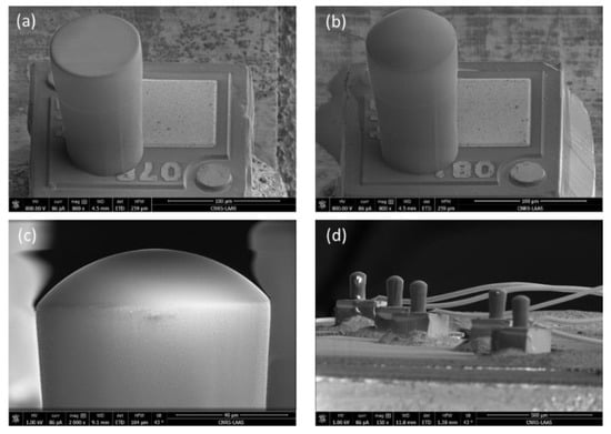 Figure 3 shows the SEM (scanning electron microscope) images of a device after pedestal fabrication (Figure 3a) and after lens integration (Figure 3b), as well as a zoom illustrating the good surface quality of the lens (Figure 3c) and a general view of different VCSELs chips after wire bonding (Figure 3d). Such technology offers a new, efficient, cheap, and straightforward solution for single or multiple VCSEL chip(s) collimation(s) at a post-dicing stage.