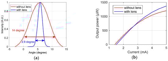To verify the collimation effect of our microlens, we measured the divergence angles of the bare VCSELs and lensed VCSELs in the same mode. The applied current in both cases was fixed at 3 mA, and the typical divergence curves obtained before and after lens integration are shown in Figure 4a. The full 1/e2 divergence angle of the VCSELs could be effectively decreased from 14° (in red) down to 2.9° (in blue). The maximal variation observed on the final beam divergence of the five different VCSEL chips shown in Figure 3d was 2.68 ± 0.27°, demonstrating the good reproducibility of the developed fabrication method. We also performed light-current characterizations to evaluate the VCSEL performances after lens integration. As seen in Figure 4b, only a slight modification of the L-I-V curve was observed. The threshold current of the VCSEL without lens was around 1.3 mA, while the current for the lensed-VCSEL was 1.5 mA. This phenomenon was linked to the presence of polymer material at the VCSEL surface, as microlens insertion slightly changed the reflexion coefficient of the top mirror [28]. Finally, we checked that the DOP (degree of polarization) of all VCSELs was kept higher than 75% after lens integration.
