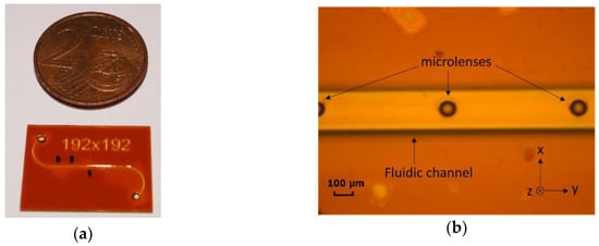 For the reactor, a 192 μm × 192 μm square microchannel chip was fabricated by stacking four DF-1050 films using standard photolithography and lamination techniques on a glass substrate. A microlens of the same size as the VCSEL (diameter 80 µm) was printed on the top surface on the chip for laser beam focusing at the center of the channel. A general view of the microfluidic platform is shown in Figure 5a. In this case, microlens centering on the channel was achieved by means of localized surface treatment (SAM, for self-assembled monolayer) applied before the inkjet printing step. Figure 5b shows an image of the lenses fabricated on the top surface of the central part of the microfluidic channel.
