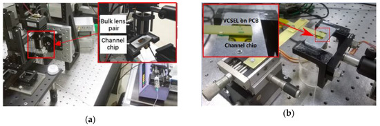 Here, a series of flow rate measurements inside a 192 × 192 μm DF micro-channel were applied to investigate the sensing performance of two OFI systems. First, we tested a standard VCSEL chip in TO46 package mounted onto a laser mount (224 TEC TO-Can Laser Mount, Arroyo Instruments) without microlens on the laser and no lens on the channel. This basic setup served as a reference, and it is shown in Figure 7a, where the inset indicates the bulk glass lens pair. In the secondary measurements, we used the new miniaturized system proposed above as the sensor scheme. The entire setup is sketched in Figure 7b. In both cases, the incident angle between the laser axis and the normal to the channel was around 10 degrees. This value was selected because, for the integrated lens system, it is a good trade-off between the Doppler frequency shift and the minimum possible distance from the PCB to the channel chip. In this configuration, the distance from the integrated sensor to the channel top surface was around 1 mm, and the collimation beam diameter was approximately 40 μm. The focusing lens could efficiently collect this on the channel surface. Of course, because of the bulk optics, the operating distance for the basic setup is much higher (around 8 mm). In both optical configurations, the sensor position was controlled by micrometric translation stages. It was set so that the acquired signal spectrum showed the highest amplitude in the frequency domain of interest.