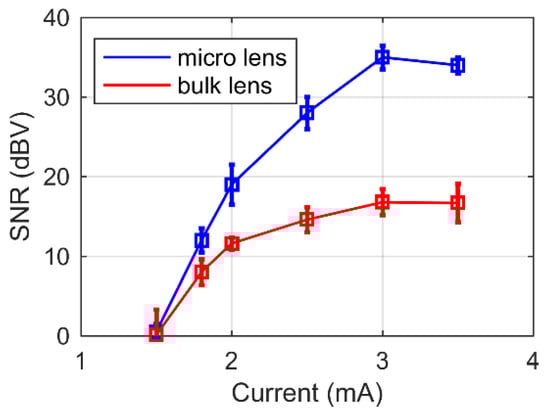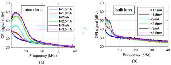 The signal level profiles as a function of the current are depicted in Figure 9. The spectral signal increases with the current, whereas when the current was set at 3 mA, the OFI signal level achieved a maximal value (around the 33 dB). This signal level was 16 dB higher compared to the bulk lenses. Moreover, even when the current is continuously increased beyond 3 mA, the OFI signal remains constant [29].