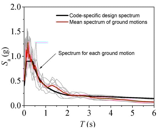 Ground motions (GMs) are selected from the PEER (Pacific Earthquake Engineering Research Center) NGA (Next Generation Attenuation) strong motion database (http://ngawest2.berkeley.edu) to be compatible with the design spectrum in the CSDB code [39] at the main period points. Since a suite of 3 to 11 GMs is usually recommended in codes [39,40,41] to get an accurate assessment of structural response in seismic design procedures, a total of 7 GMs (see Table 3) are used in this study. The matching to the design spectrum of the building site is shown in Figure 2.