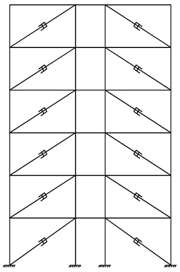 where C is the damping coefficient, α is the velocity index, and v is the relative velocity. In the following numerical example, α is set as 1.0 corresponding to a linear viscous damper. The TwoNodeLink element with Maxwell material in OpenSees is used to model the viscous dampers [37]. The Maxwell material model comprises a series-wound stiffness spring and damping pot. The force from the damping pot is calculated by using Equation (1), and the stiffness is commonly selected within 2~3 times the value of coefficient (2.5 times is used in this study). Based on the survey of some companies’ products, the commonly used damping coefficients of viscous dampers are 20, 50, 100, 150, 200, 250, 300, 350, 400, 500, 600, 750, 800, 1000, 1200, 1300, 1500, 1600, 1800, 2000, 2500, 2600, 2800, 3000, 3300, 3500, 3600, 3800, 4000, 4800, 5000, 5200, 5600, 6000, 6700, 8000, 8700, 9300, 10,000, 12,000, 15,000, 18,000, 20,000, 24,000, 26,000, 28,000, and 30,000 kN·(s/m). These parameters can be referred in the retrofitting procedure.