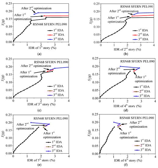 Variation of the collapse resistance in the optimum procedure (using Initial scheme 1 as an example; IDR: Inter-story drift ratio): (a) 1st story, IDA (incremental dynamic analysis) curves; (b) 2nd story, IDA curves; (c) 3rd story, IDA curves; (d) 4th story, IDA curves; (e) 5th story, IDA curves; (f) 6th story, IDA curves.