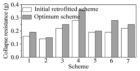 Comparison between the structural collapse resistance of the initial retrofitted scheme and the optimum retrofitted scheme.