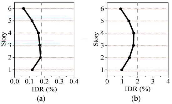 Average inter-story drift ratio (IDR) under frequent and rare earthquakes: (a) Frequent earthquake; (b) Rare earthquake.
