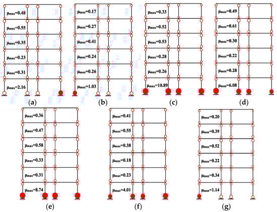 Locations of yielding in columns of optimum retrofitted frame: (a) GM 1; (b) GM 2; (c) GM 3; (d) GM 4; (e) GM 5; (f) GM 6; (g) GM 7.