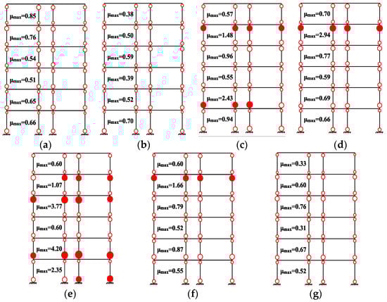 Locations of yielding in columns of initial retrofitted frame (Initial scheme 5): (a) GM 1; (b) GM 2; (c) GM 3; (d) GM 4; (e) GM 5; (f) GM 6; (g) GM 7.