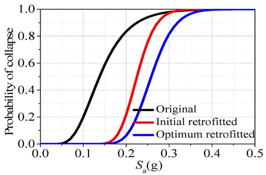 Figure 9 shows the fragility curves of the original frame, initial retrofitted frame, and the optimum retrofitted frame. In this figure, the result of the original frame was also provided because we want to illustrate both the retrofitting effect on the original structure and the optimum effect on the initial retrofitted frame. The figure shows that the collapse probability of the optimum retrofitted frame is the smallest, which demonstrates that the placements of viscous dampers can increase the structural collapse-resistant capacity. The maximum decline of collapse probability between the original and optimum retrofitted frames is 77.26%, and that between the initial retrofitted and optimum retrofitted frames is 33.53%. Note that the retrofitting costs of the initial retrofitting and optimum retrofitting are the same.