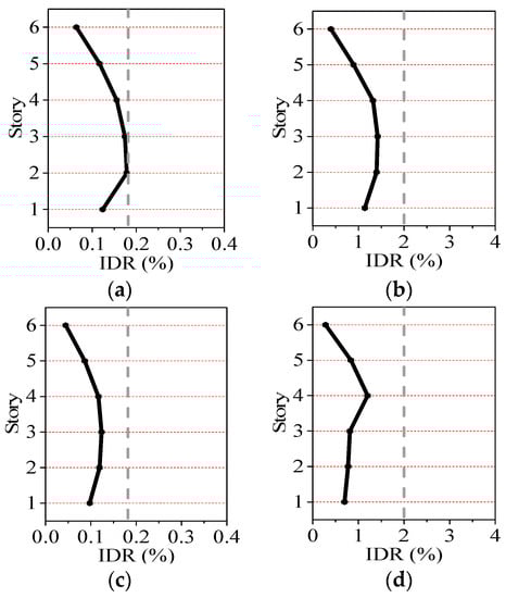 Average inter-story drift ratio (IDR) under frequent and rare earthquakes: (a) X direction, frequent earthquake; (b) X direction, rare earthquake; (c) Y direction, frequent earthquake; (d) Y direction, rare earthquake.