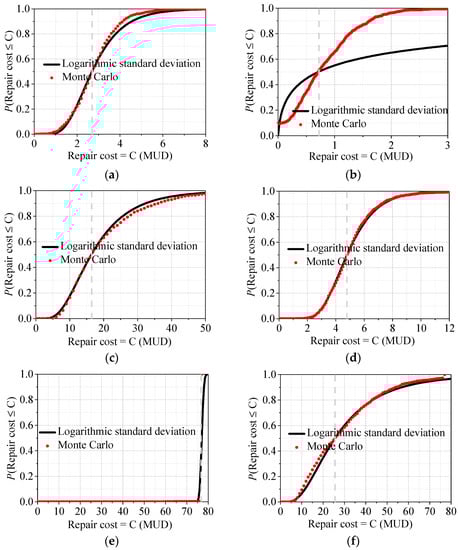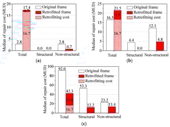 Figure 12a–f compares the repair costs between the original frame and retrofitted frame. These figures show that the probabilities are smaller than the specific repair cost levels. Figure 13 shows the median repair costs, which are the values corresponding to a probability of 50% in Figure 12. In the figure, we added the retrofitting cost (16.7 MUD) into the total repair cost in order to compare the economic benefit. The figure also compares the repair costs of structural members and non-structural members, respectively. According to FEMA P-58 [49], when the structure is seriously damaged, as in the case shown in Figure 13c, it is necessary to demolish the structure and remove it from the site. Hence, the repair cost (or the replacement cost, which is more rational here) includes the cost to demolish the damaged structure and clear the debris in addition to replacing the structure “in-kind”. Demolition and site clearance will increase structural repair costs by up to 20–30%. Under the rare earthquake excitation, the original frame collapses; therefore, the total repair cost increases by 20% in the calculation, i.e., 76.7 × 120% = 92.04 MUD. Hence, the ratio between the cost of complete replacement and the cost of retrofitting is about 45%.