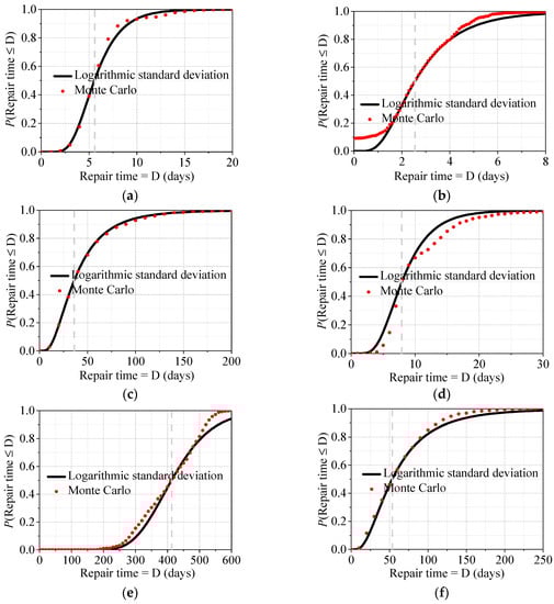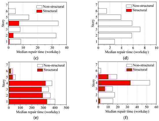 Median values of repair times under different earthquake intensities (parallel construction): (a) 3D original frame, frequent earthquake; (b) 3D retrofitted frame, frequent earthquake; (c) 3D original frame, occasional earthquake; (d) 3D retrofitted frame, occasional earthquake; (e) 3D original frame, rare earthquake; (f) 3D retrofitted frame, rare earthquake.
