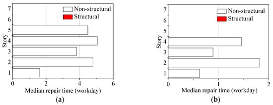 Figure 14a–f compares the repair times between the original frame and retrofitted frame. These figures show that the probabilities are smaller than the specific repair time levels (using the number of workdays as an index). Figure 15 shows the median repair times, which are the values corresponding to a probability of 50% in Figure 14. Table 11 shows the total median repair times of the original frame and the retrofitted frame under a frequent earthquake, occasional earthquake and rare earthquake. The observations are that (1) There are no obvious differences when the two frames are hit by a frequent earthquake, in both cases the repair times are within one week. (2) The repair time for the retrofitted frame is shorter than that of the original frame under an occasional earthquake, requiring 7 workdays for the retrofitted frame and 34 workdays for the original frame. (3) The repair time for the retrofitted frame is obviously shorter than that of the original frame under a rare earthquake, where 53 workdays are required for the retrofitted frame and 402 workdays for the original frame. In this case, the original frame collapses and needs reconstruction. Similar to the calculation of repair cost, demolition and site clearance will increase the structural repair time by up to 20–30%; therefore, the total repair time under rare earthquakes increases by 20%, i.e., 402 × 120% = 482 workdays. Therefore, the ratio between the repair time of retrofitting and the repair time of complete replacement is about 10%. Note that the shorter the repair time to a building, the less the impact of environmental problems.