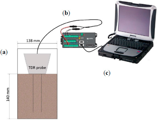 Scheme of time-domain reflectometry (TDR) acquisition set-up. (a) Soil column with the TDR probe; (b) data-logger; (c) external PC for data processing.