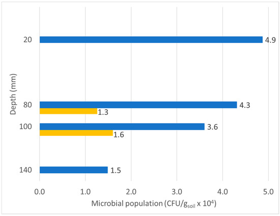 Microbial diesel-degrading population in the mesocosms (CFU/g of soil). Blue: forced aeration mesocosm. Yellow: control mesocosm. Initial microbial concentration in forced aeration mesocosm is 1.25 × 103 CFU/g of soil.