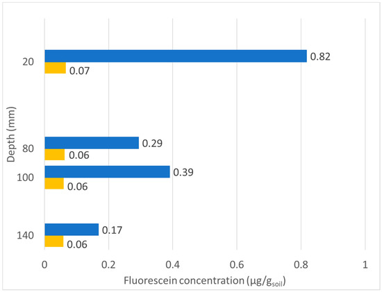 Anyway, if we consider the results of the biological activity, it is realistic to assume that, at least in the aerated system, a process of degradation occurred because, in previous research, on the same soil and in similar conditions, degradation of diesel compounds was quantitatively estimated [3]. In fact, the microbial population of the mesocosm with aeration and inoculum was significantly higher than that of the natural aeration column (Figure 2). An evident stratification was also observed: near the surface, the number of microorganisms was very high, up to 5 × 104 CFU/g of soil, that decreased going toward the bottom of the column (about 1.5 × 104 CFU/g of soil) against initial population due to inoculum equal to 1.25 × 103 CFU/g of soil. The microbial community distribution was confirmed by FDA analyses, as shown in Figure 3. In the control column, the microbial population along the depth of the column was fairly uniform (about 1.5 × 104 CFU/g of soil) and similar in value to that of the bottom of the aerated column. FDA again confirmed these results.
