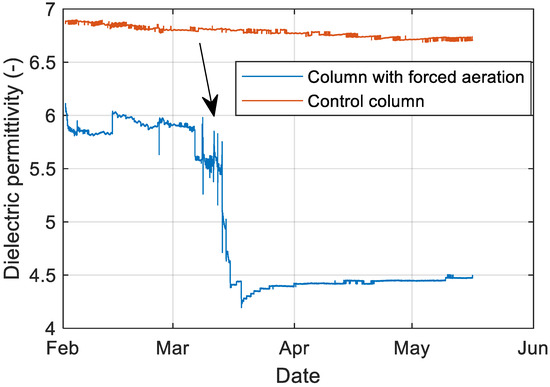 Regarding the control column, a slight and constant decrease of the dielectric permittivity was observed (Figure 8). Applying the CRIM model, we noted that the changes of the dielectric permittivity can be justified by a loss of about 9% of diesel oil, or about 3% of water (α calibration exponent = 0.4); moreover, it can be supposed that the slow and constant decrease of the dielectric permittivity was caused by displacement of fluids, or by the progressive pore clogging due to the coating of grain particles caused by organic matter. This latter phenomenon was also reported by Mori et al. [16].