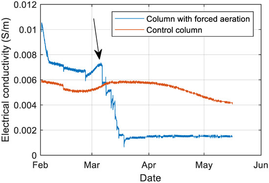 The electrical conductivity has a more interesting trend (Figure 9). After an initial decrease, the electrical conductivity increases until the second half of March (t = 50 days). Then, it gradually decreases till the end of the experiment, namely from 0.006 S/m to 0.004 S/m. The observed values of conductivity could be justified, according to the Archie model, by a decrease in water content from 0.2 to 0.175 (about 13%), but this explanation is not consistent with the dielectric permittivity measurement. The electrical conductivity variations are probably due to other phenomena as variations in salinity, for instance, which is one of the most important parameters that influence the electrical conductivity. As the evolution of electrical conductivity in soil is strictly connected to the modifications in the chemistry of the pore water, the initial decrease of this parameter could be due to the progressive depletion of nutrient salts present in MSMB solution used to stimulate bacterial activity. Anyway, the Archie model takes into account the electrolytic conductivity phenomena only; this cannot explain the overall variations of the observed changes in the conductivity. At a later stage of the experiment, the observed increase of the bulk conductivity is reported also by Atekwana et al. [40] and Masy et al. [17]. They linked this effect to an enhanced biological activity, which probably led to the production of acids as co-metabolites, or as products of the dissolution of CO2 in water. Then, the consequent acidification of pH could dissolve some inorganic salts present in the soil, causing an increase of salinity in the pore water and therefore in the electrical conductivity. Studies at field-scale showed that bacterial mineralization of organic compounds augments CO2 in the aquifer and produces organic acids that increase mineral weathering [41].