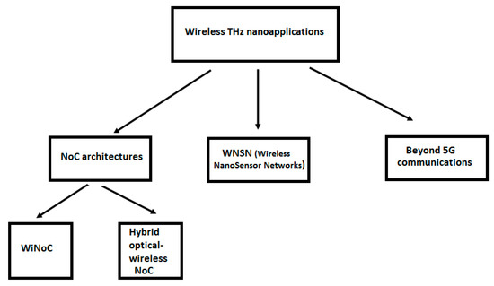 The rest of this paper is structured according to these two pillars, wireless THz nanoapplications and the implementation of future THz transceiver components. Section 2, Section 3 and Section 4 are each dedicated accordingly on these three major wireless THz nanoapplications, namely NoCs, WNSNs and beyond 5G communications. In each of these sections, in-depth reference material is provided, which includes the latest literature findings regarding the fundamental aspects of plasmonic technology roles and accompanied photonic technologies whenever required, for each one of these wireless THz nanoapplications, respectively. In Section 5, we focus individually on each critical plasmon based, or hybrid component part of a wireless THz nanocommunication link, namely the antennas and the transceiver parts. Finally, we conclude the paper in Section 6, by also providing two summary tables, with all the information aggregated, including all, state of the art and beyond state of the art characteristic plasmon based and hybrid achievements, for equipping future competitive THz nanoscale communication systems and wireless THz nanoapplications, accordingly.