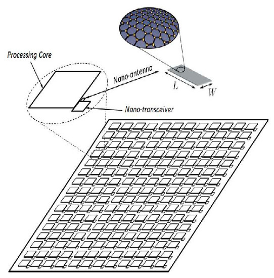 GWiNoC, is a relatively recent approach that relies on graphene material for implementing not only nanoantennas [33], but also any other THz wireless transceiver part, for fully equipping the interconnection between the cores of a multiprocessor. As mentioned above, it is not feasible to reach extremely high resonant THz band frequencies by simply scaling down current metallic antennas [34], at the expected size of a nanosystem (a few μm) [35], as it would result in a huge channel attenuation. Graphene based nanoantennas on the other hand, are inherently just a few micrometers in size, i.e., two orders of magnitude below the dimensions of future metallic on-chip antennas, and hence they could provide inter-core communication in the THz band (usually between 0.1–10 THz). These graphene inherent features would offer both size compatibility with each continuously shrunk processor core, as well as adequate bandwidth for massively parallel processing.It seems that the ultimate WiNoC design target has been already set, consisting of a single graphene based nanoantenna and a nanotransceiver interconnected for each individual processing core, for managing the data of outgoing and incoming transmissions to the antenna respectively.