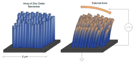 Energy harvesting is based on the piezoelectric effect seen in zinc oxide (ZnO) nanowires.