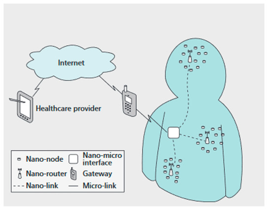 As far as concerns in the biomedical applications domain, graphene based nanoantennas have been used for wireless communication between nanosensors, deployed inside and over the human body, resulting in many bio-nanosensing applications [72]. In-vivo wireless nanosensor networks (iWNSNs) at the THz band, is a characteristic application for providing fast and accurate disease diagnosis and treatment [73]. These networks, fully equipped with nanoscale components (e.g., nodes, routers, gateways, links and interfaces) as in regular networks, as seen in Figure 5, are operating inside the human body in real time, achieving precise and real time medical monitoring and medical implant communication. Apart from iWNSNs, graphene plasmons have also been used in biological sensing applications, monitoring the rotational and vibrational modes of DNA molecules and many large proteins in the THz and far-IR [74,75]. Moreover, as far as concerns imaging applications, and especially the THz band spectroscopy, nanosensors have been used for backscattering techniques for monitoring the dynamics of large biomolecules [76]. A THz biosensor communicating with the biological agents through a graphene plasmonic waveguide is described in [77]. In this sensor, SPPs in the waveguide must be launched by either an external near-field source or an antenna. In [78], another biosensor system has been proposed, where all the required elements (the sensor, frequency modulator, and antenna for energy harvesting) are packaged in a single module [78]. This structure has been designed as a dual resonant antenna part of a GFET.
