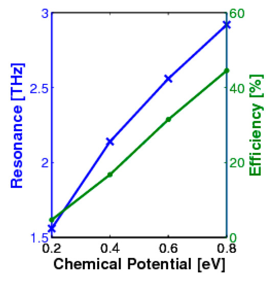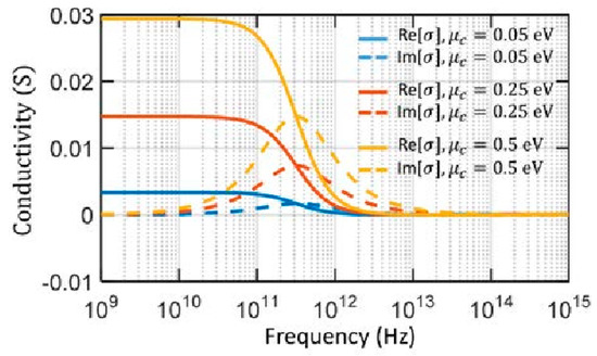 An example of graphene’s dispersive conductivity is shown in Figure 6. In general, the chemical potential variation is directly related to the applied voltage variation. As implied in Figure 6, higher chemical potential leads to better performance through an increase of the conductivity. Figure 7 shows the resonance characteristics of the antenna as a function of the chemical potential. The increase of chemical potential leads to a significant shift of the resonant frequency and to an enhancement of the antenna response without changes in the radiation pattern [105].