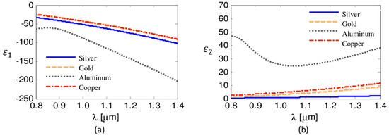 Absorption enhancement based on metal nanoparticle dispersive properties of metal nanoantenna structures is also a critical design issue that needs also consideration. These metal nanoparticle dispersive properties response of different metals at THz range are also described by the Drude–Lorentz model by relative complex permittivity of metal nanoantennas as a function of frequency as seen in Figure 8 [106], with ε1 the real part of the relative permittivity, and ε2 is the imaginary part of it. Different metal nanoantennas like gold, silver, copper and aluminum are considered.