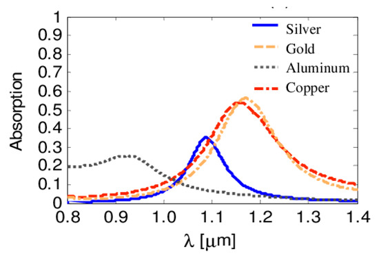 An approximate 20% increase in absorption performance is obtained. The frequency that corresponds to the maximum absorption is dependent on the nanoparticle material. The maximum absorption is observed in gold nanoparticle material, as seen in Figure 9 [106]. The frequency of the maximum absorption moves toward lower frequencies as physical dimensions of the nanoparticles increase. Hence, the choice of the best plasmonic material for a given application is a subject of discussion and research. It has been also proved that the radiation frequency of the graphene nanoantenna can be tuned in a wide spectral range by adjusting the dimensions and particularly its length. According to [107], the absorption cross section increases up to a given limit with the substrate size, and hence, a larger substrate improves the performance of the graphene nano-antenna. Moreover, the absorption cross section increases as the graphene patch is located closer to the side of the substrate, while the resonant frequency becomes higher when the patch is farther from the center [107].