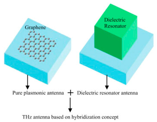 As mentioned in the previous section, all plasmon based THz solutions are characterized by relatively high losses of the supported SPP modes, especially during waveguide propagation, hence hybrid combinations of plasmonic resonators with dielectric waveguides appear to be an attractive alternative solution. We may at this point, consider a broader generic hybrid combination of surface plasmon with dielectric wave modes, providing better results between mode confinement and propagation loss in the THz band, as seen in Figure 11 [116]. In other words, graphene may be used either for the development of plasmonic waveguides, or antennas in hybrid combinations with dielectric material. Specifically, as far as concerns graphene based waveguide structures, and given that THz plasmons can be confined laterally in a graphene sheet [117], this property has led to an opportunity of implementing many different graphene based waveguide structures, consisting of a number of graphene layers, mixed with dielectric materials [118], or with dielectric-metal structures [119], obtaining excellent field confinement results. Other approaches involve the use of graphene layers to form wedges [120], or coat grooves carved on the dielectric [121], or a waveguide consisting of a dielectric with high permittivity, on top of a low index dielectric-graphene-dielectric stack [122].