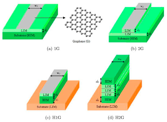 As far as it concerns graphennas, such structures are based on a number of graphene layers, on a metallic flat surface, a dielectric material in between, and a feed to drive the signals to the antenna, as seen in Figure 10. Other antenna structures, such as patch antenna, and dipole designs, where the feeding mechanism lies in between the two identical graphene patches, have been also proposed in [107,123], respectively. These structures are either based on an ideal photomixer with high impedance as the feeding mechanism, or on more advanced THz sources based on photoconductive materials [124], or on high electron mobility transistors [102]. Furthermore, graphene antennas in MIMO configurations with a considerable number of radiating elements, may be also considered as an updated efficient THz solution [125]. Alternatively, other works are based on graphene potential of tuning ability, rather than acting as a radiating antenna element. Specifically, in [126], graphene sheets are employed between the source and a metallic radiating element to retain the tunability, while in [127], a novel antenna design is proposed, based on hybrid graphene-metal structure for enhancing reconfigurability capabilities of THz antenna. Different hybrid graphene-dielectric antenna structures have been also proposed in [128], such as a two graphene monolayers separated by a thin dielectric structure, or an hybrid structure with two graphene monolayers (H2G), consisting of a layer with a high index material (HIM) for a dielectric mode, close to the graphene layer for a plasmonic mode, and separated by a spacer with a low index material (LIM), as seen in Figure 12d.