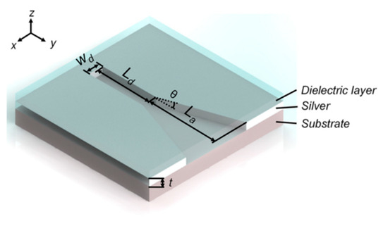 Other plasmon based nanoantennas have also been proposed, based on hybrid wireless-optical on chip communication. When designing such hybrid structures, large impedance mismatches between the resonant nanoantennas and the waveguides should be completely minimized. Proper impedance matching elements of certain permittivities are needed to be carefully employed as wireless transceiver parts, and positioned within the connecting gap between the nanoantenna and the waveguide. Classic antenna layouts applied in RF communications such as dipole, Yagi-Uda and phased array configurations [129,130,131], have been also applied in optical wireless nanolinks, using plasmonic waveguides as matching elements, between pure or hybrid plasmonic antennas and their feeding silicon waveguides. Recently, in [132], a dipole loop plasmonic nanoantenna has shown an increased operating bandwidth compared with a single loop antenna. Plasmonic horn nanoantennas proposed in [41], are impedance matched to the feeding waveguides, and show superior performance against those using dipole nanoantennas, for point-to-point optical wireless nanolink communications. A typical plasmonic horn nanoantenna is shown in Figure 13.