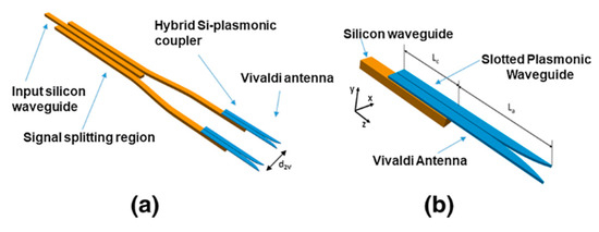 Vivaldi antennas have been also considered as an updated solution for such hybrid communications. They are usually applicable in the microwave and radio frequencies, but also in infrared/optical frequency domain. Vivaldi plasmonic antenna is formed by a slotted microstrip deposited above a silica substrate, along with a hybrid Si-plasmonic coupler, as an impedance matched element to feed silicon waveguides [43]. By increasing the number of Vivaldi antennas, an increase in the directivity and the gain is anticipated too. Hence, double Vivaldi broadside antenna [47], and antenna array configuration based on tilted plasmonic Vivaldi antennas [48], are improving the total antenna radiation performance. A double Vivaldi antenna and its coupling details are shown in Figure 14a,b respectively.