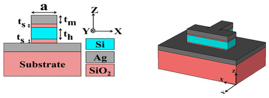 Alternatively, plasmonic nanoantennas may be fed by hybrid plasmonic waveguides, instead of pure silicon waveguides, such as the plasmonic nanopatch antenna, fed by a hybrid metal insulator metal (HMIM) multilayer plasmonic waveguide, for achieving proper impedance matching, as seen in side and top views of Figure 15 [134]. Such proposed hybrid plasmonic waveguide (HPW) based nanoantennas, show high efficiency and directivity, and improve the efficiency by minimizing losses [40].